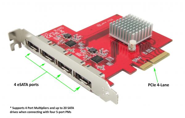 • 6 Gbps eSATA III External PCIe Gen2 x4 Lanes High Performance Host Adapter. Supports PCIe 1.0, 2.0, and 3.0 motherboard.
