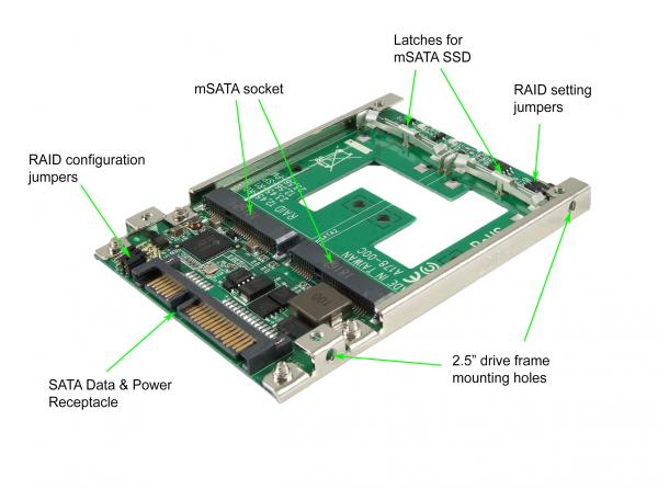 • Convert 2x mSATA SSD to a standard internal 2.5" 7mm SATA drive. It supports H/W RAID 0, RAID 1, SPAN (Big Drive) and PM (2Drives) Modes. Note: SATA Host is required to be Port Multiplier capable for PM Mode.