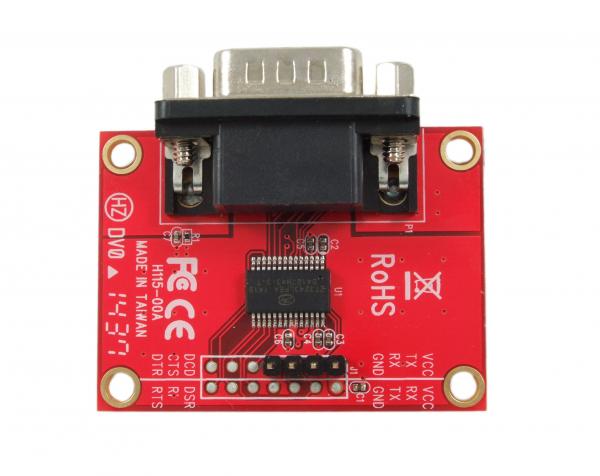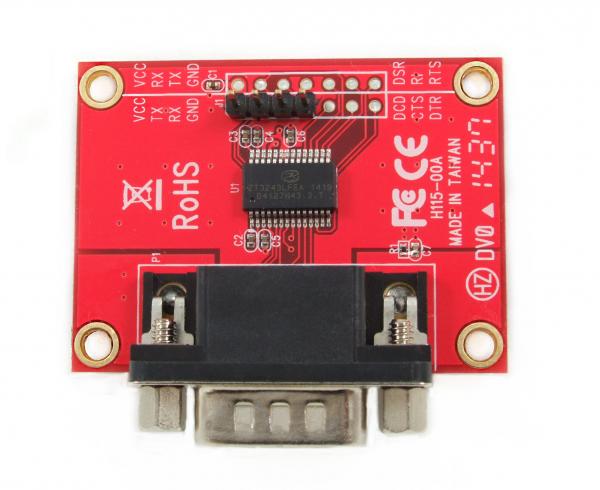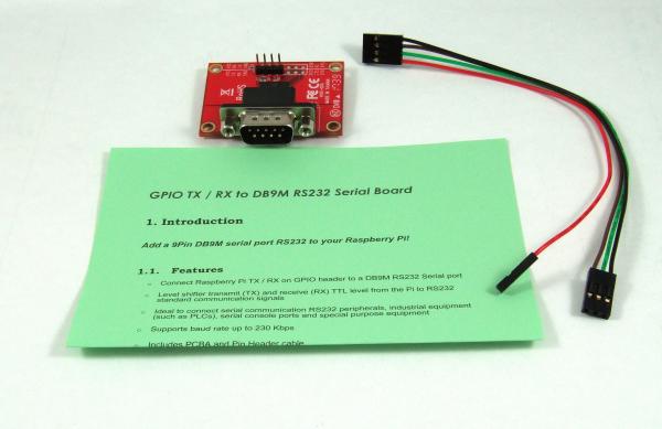 Level shifter serial transmit (TX) and receive (RX) TTL level from the Pi to RS232 standard communication signals. Includes a PCBA and Pin Header cable for connecting with Pi GPIO.