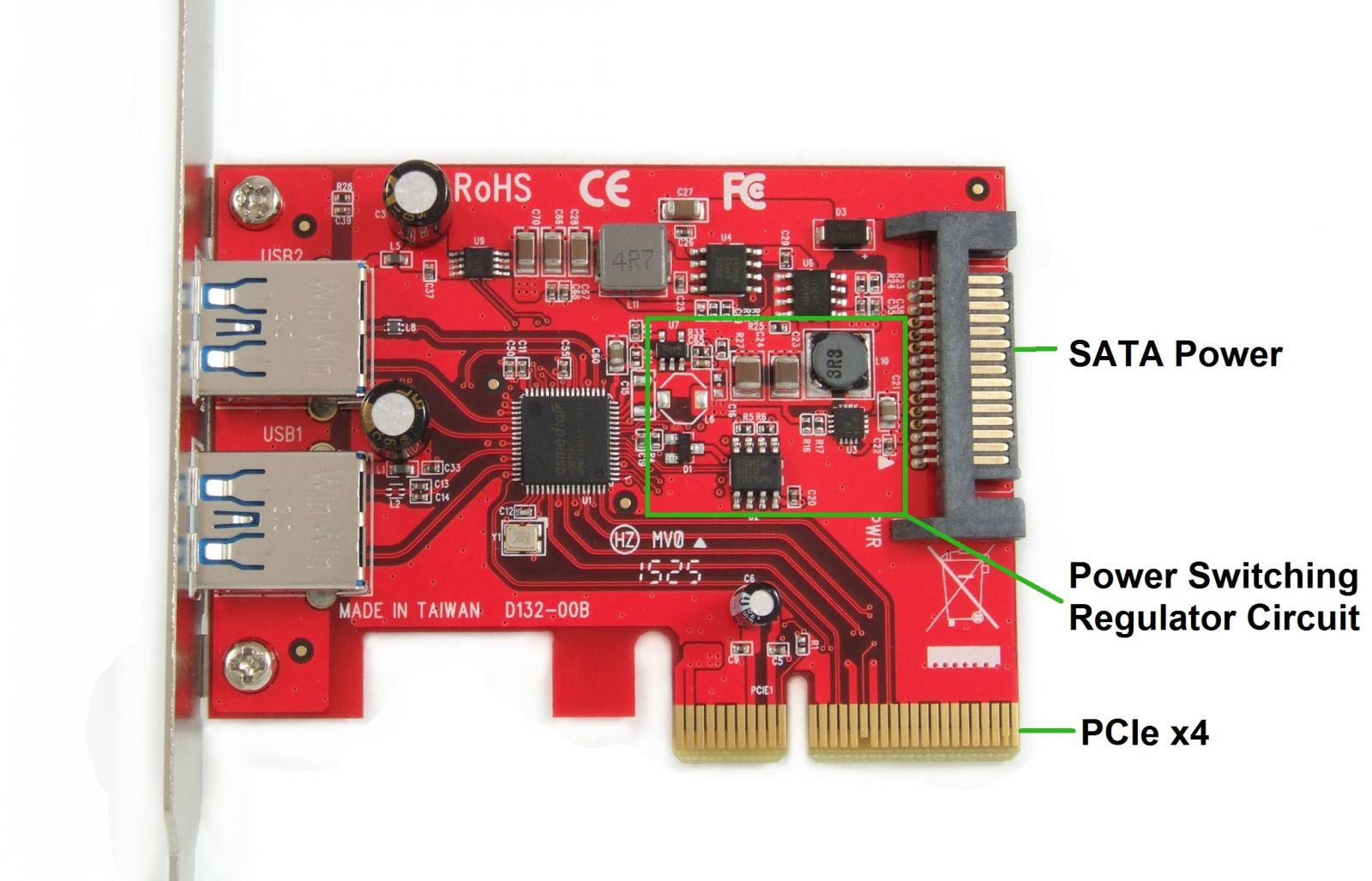 Instead of taking 5V power directly from power supply, our design includes power switching regulator circuit that automatically converts 12V from PCIe bus and/or from 15-Pin SATA power to ensure sufficient 5V/2A bus power on each USB port.
