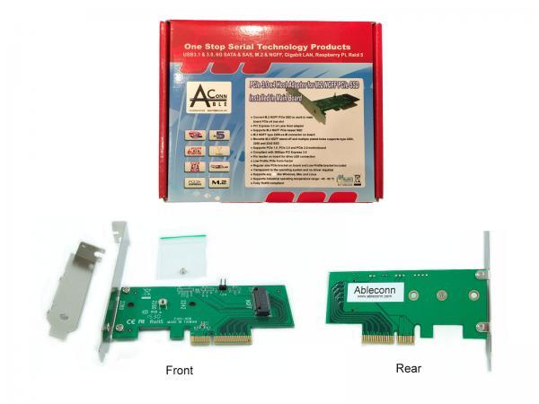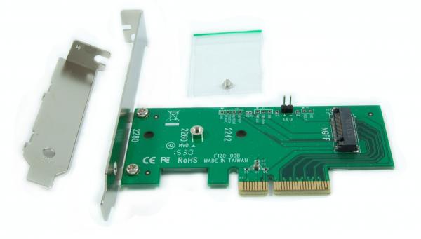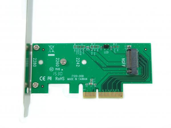 The adapter can take M.2 PCIe (AHCI or NVMe) SSD in length of 42, 60 and 80 mm.